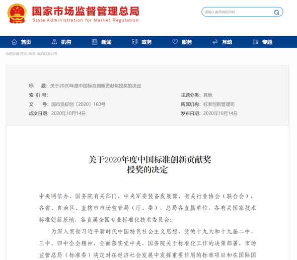 中国标准创新贡献奖是经国务院批准、由国家质检总局和国家标准委组织的我国标准化领域最高等级奖励,分为标准项目奖、组织奖和个人奖,每两年评选一次。