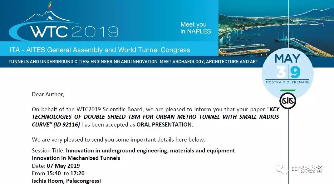 此次论文撰写编译等工作由中铁装备设计研究总院牵头,与集团公司科技部、国际事业部共同完成。现已接到WTC2019科技委员会邮件通知:论文《双护盾TBM在小曲线地铁隧道中的应用关键技术》已被选中在2019年世界隧道大会上作交流发言。中铁装备将坚持技术创新,以“共享、共赢”的思想构建隧道掘进机技术国际化生态圈,为世界掘进机技术贡献力量。