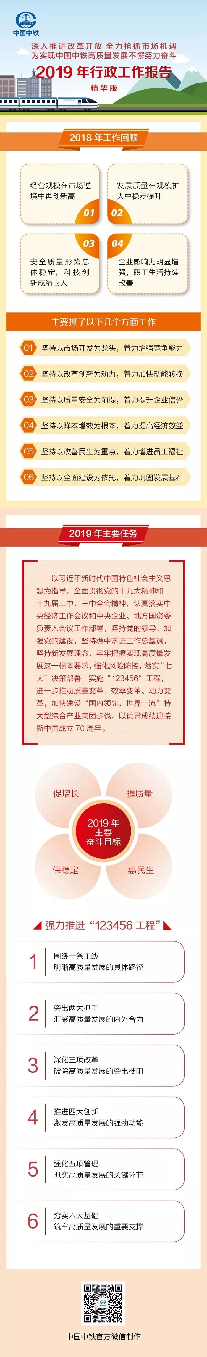张宗言作行政工作报告,对全公司2018年取得的显著成绩给予了充分肯定,明确了2019年企业生产经营主要奋斗目标和重点工作。他指出,2018年,中国中铁坚持以习近平新时代中国特色社会主义思想为指导,深入贯彻党的十九大精神,认真落实党中央、国务院和国资委各项决策部署,紧紧抓住创新驱动与质量为本两大关键,知机识变、顺势而为、锐意进取,推动各项工作取得了显著成绩。他强调,2019年是新中国成立70周年,是全面建成小康社会关键之年,也是中国中铁努力推进企业高质量发展的重要一年,全公司上下要以习近平新时代中国特色社会主义思想为指导,深入推进改革开放,积极抢抓市场机遇,全力推进中国中铁高质量发展,以优异成绩迎接新中国成立70周年。