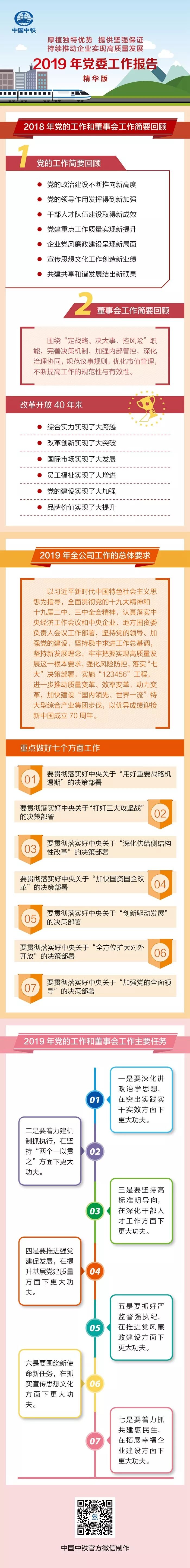 2月21日,中国中铁二届五次职代会暨2019年工作会议在京召开。国家审计署企业审计八局处长贾红雨,正处级审计员张晶,主任科员任勇等领导到会指导。中国中铁领导班子成员及高管李长进、张宗言、周孟波、刘辉、章献、王士奇、杨良、于腾群、段永传、刘宝龙、刘建媛、张回家、孔遁、马江黔、何文;独立非执行董事郭培章、闻宝满、郑清智,非执行董事马宗林;联席公司秘书谭振忠;总部部门正职及以上人员、专职产权代表;所属各单位党政纪工团主要负责同志、直属项目部、指挥部负责人;二届五次职代会代表、列席代表;三级综合工程公司20强和专业工程公司20强代表以及中国中铁出席党的十九大代表、第十三届全国人大代表、第十三届全国政协委员等近500人共商企业改革发展大计。