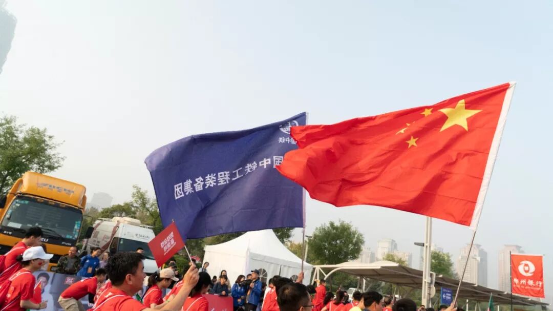 中国红的五星红旗和科技蓝的中铁装备司旗在2019郑州国际马拉松赛道上迎风飘扬