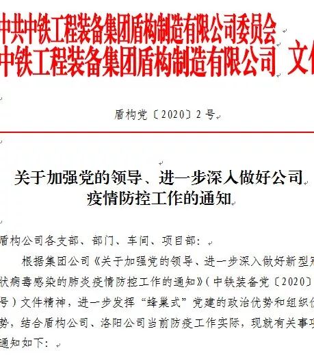 新型冠状病毒感染的肺炎疫情发生以来,盾构公司按照党中央、国务院、地方政府及集团公司统筹部署,通过加强党委领导,坚定抗疫信心;通过全链条把控,与供方客户同舟共济;通过网格化管理,实现科学防控;通过超前部署,为做好复工精准施策。