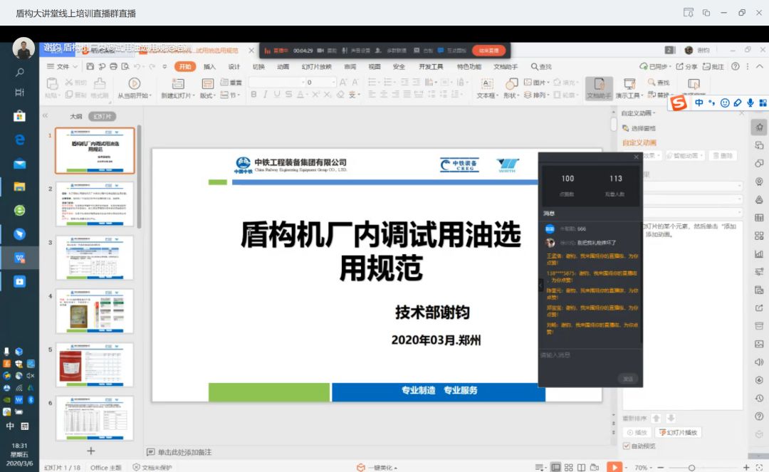 3月6日晚上6:30,“盾构大讲堂线上培训直播”平台首播告捷,首堂直播课《盾构机厂内调试用油选用规范》培训,观看人数达近200人,直播平台上互动频频、讨论热烈,切实达到了“寓教于乐、互相学习”的目的。