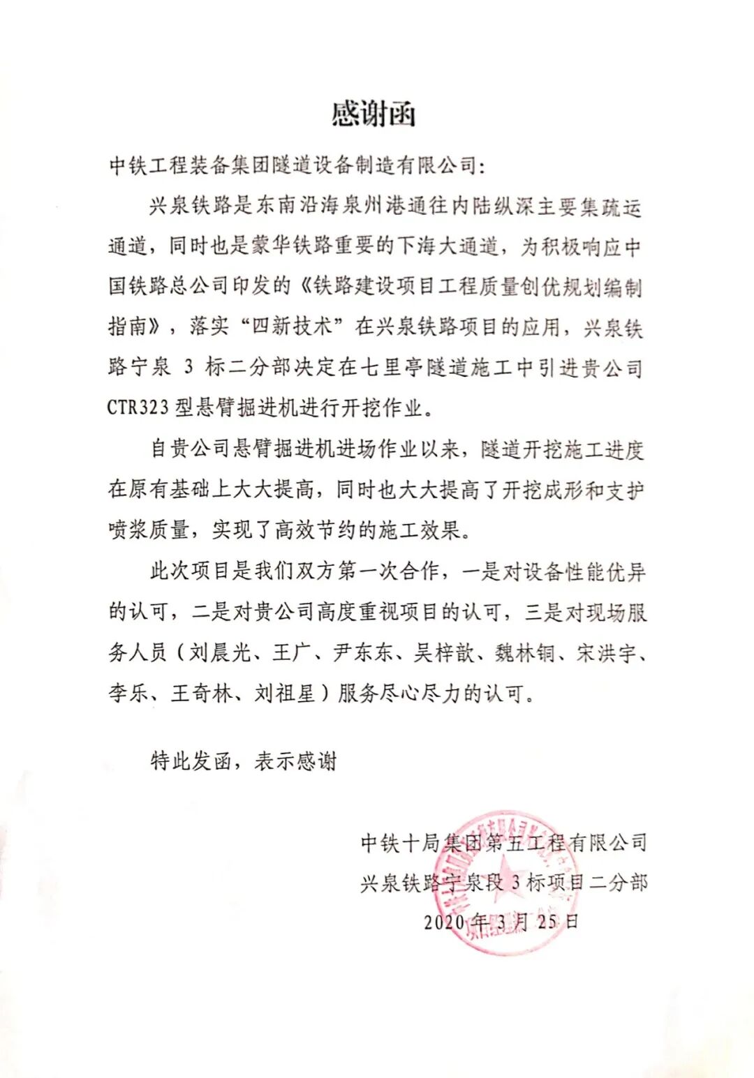 此次悬臂掘进机施工采用“设备+操作手”工程租赁服务模式,中铁装备设备公司专门在该项目成立青年突击队,施工过程中,突击队充分发扬艰苦奋斗精神,凭借专业的技术实力和丰富的操作经验等优势,实现了悬臂掘进机安全、高效掘进,确保了工期目标,受到项目部高度认可。