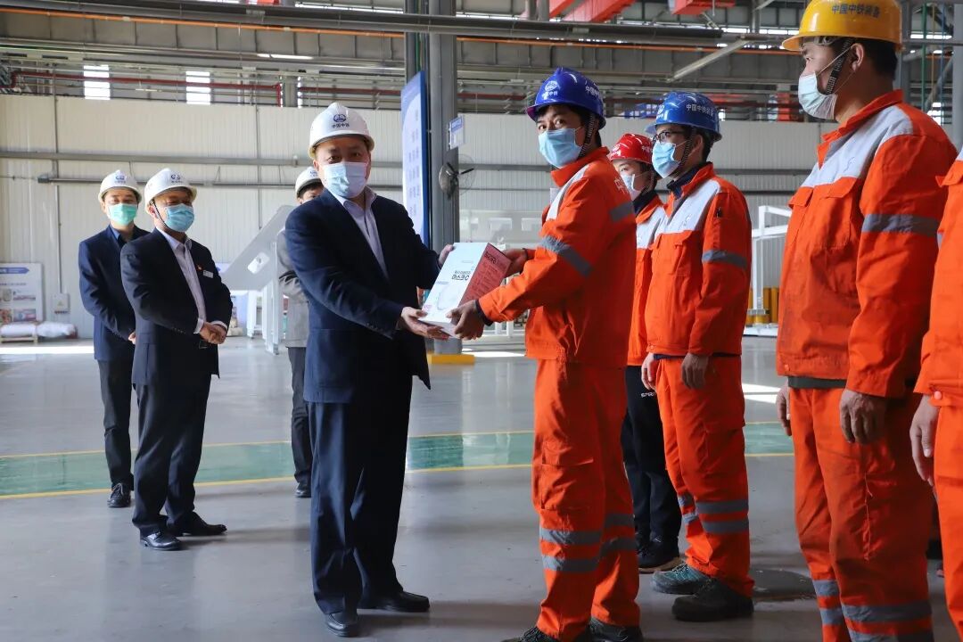 李公良副主任一行深入一线,详细了解厂区建设以及重点项目、生产组织等情况,并结合公司近期人员到岗情况,向一线员工送上口罩,叮嘱大家要继续做好日常防护,安全、健康地投入复工复产中去。