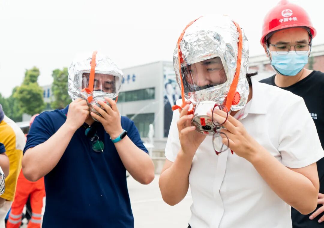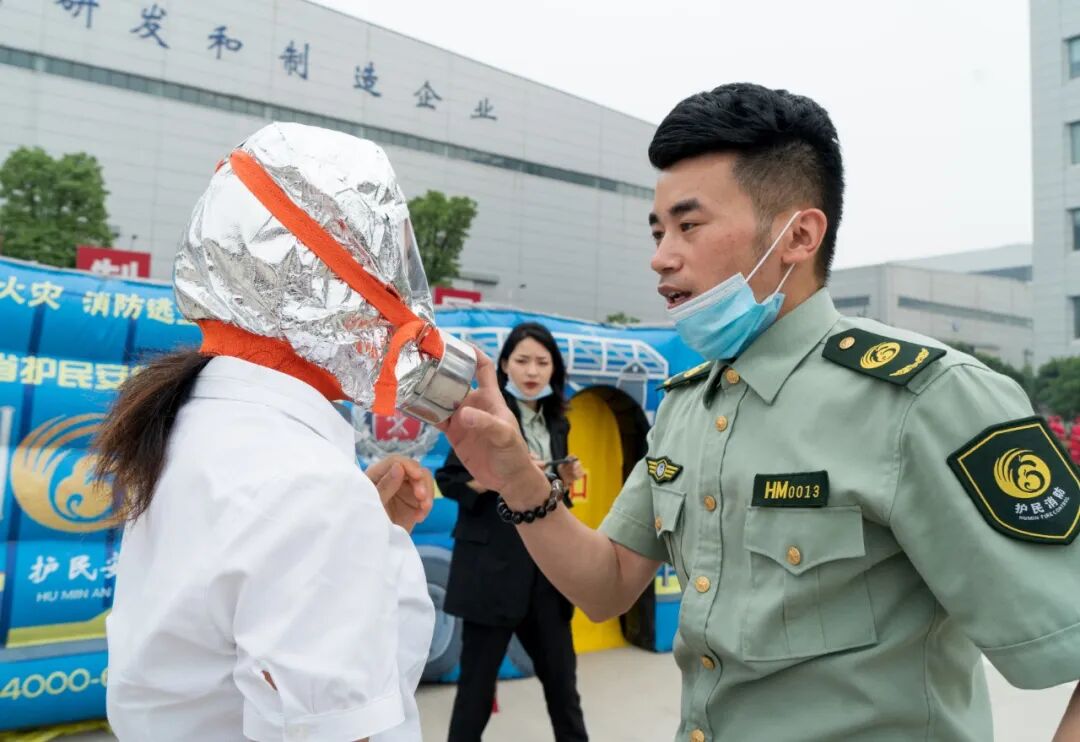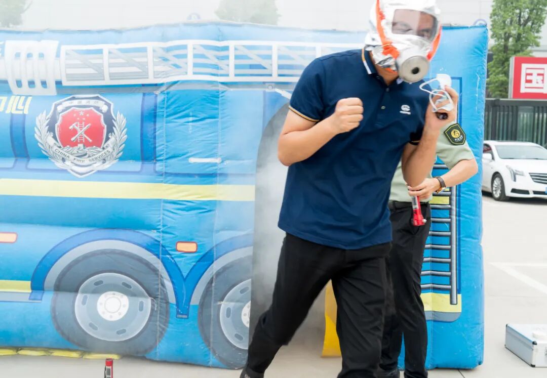 火灾逃生屋利用场景布置,模拟出烟雾弥漫、无视线、闷热等火灾现场环境,演练人员现场学习正确佩戴防毒防烟面罩,深刻体验火灾发生时逃生自救的情景,有效掌握了应急自救知识。