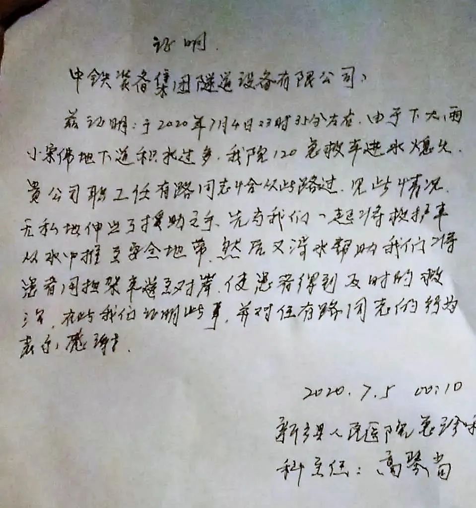 晚上11时30分,中铁装备设备公司专用设备研究院工程师任有路,因为第二天要加班,连夜开车从郑州赶回新乡宿舍。“雨下得特别大,走到新乡县小冀镇的时候,小宋佛地下道水特别深,我正犹豫要不要过,就看见迎面开来的救护车一头扎了进去,熄火了。”