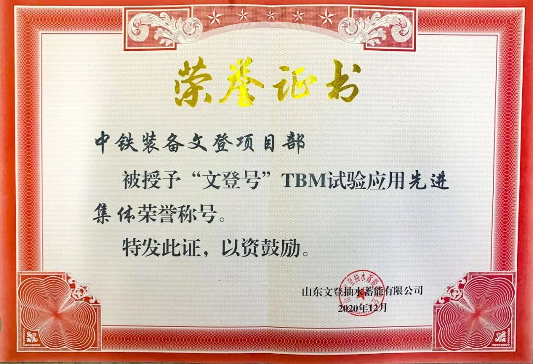 2020年12月8日,业主方山东文登抽水蓄能公司召开世界首台紧凑型超小转弯半径硬岩TBM”文登号”试验应用表彰大会,授予北京院设代处、中铁十四局、中南公司文登监理中心、中铁装备集团文登项目部等4个团队”先进集体”的荣誉称号,授予参与文登试验项目并做出突出贡献的47人“先进个人”荣誉称号。此次表彰大会意味着文登试验项目的顺利收官,也代表了业主方对中铁装备文登项目部的充分认可。