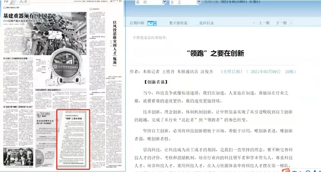 坚持自主创新,必须将科技创新根植于市场、着眼于应用,唯创新者进,唯创新者强,唯创新者胜。近日《光明日报》就科技创新对中铁装备总经理赵华进行专访,我们一起来看中铁装备的“创新”之要!