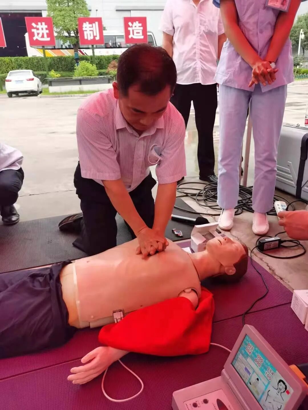 公司还邀请泰和社区医院的医护人员,现场进行CPR心肺复苏模拟教学。