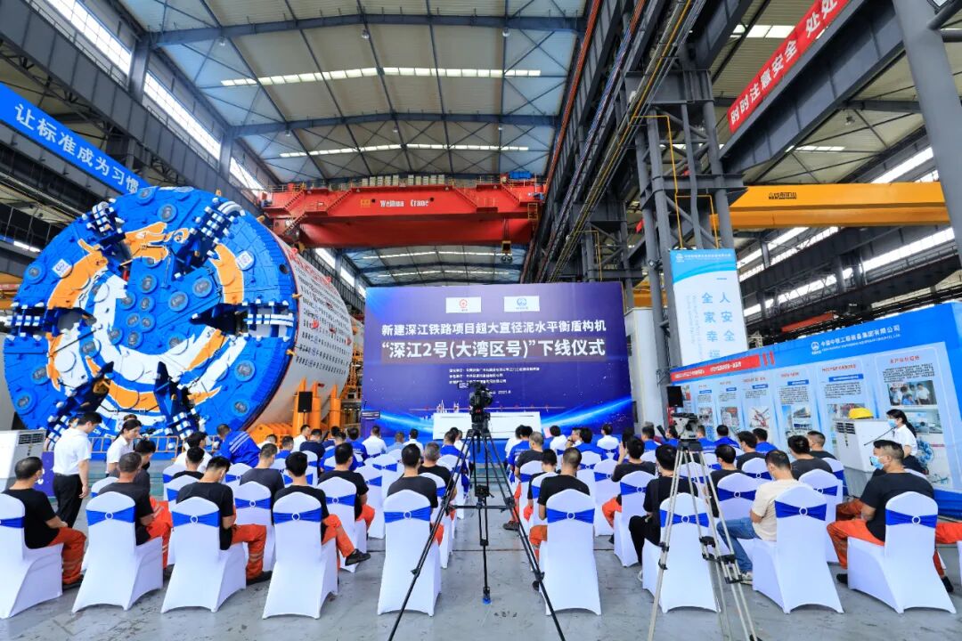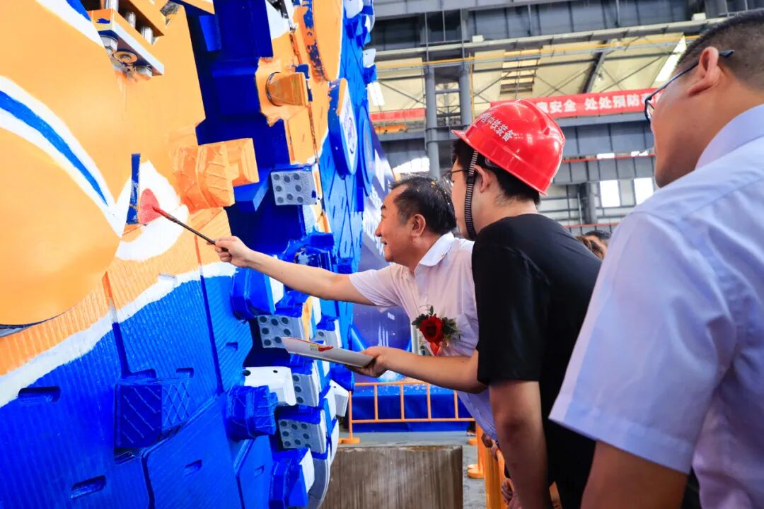 “大湾区号”超大直径泥水平衡盾构机作为深江铁路珠江口隧道建设的施工利器,被寄予厚望。设计者们在刀盘上喷涂“蛟龙”,寓意这台“地下蛟龙”乘风破浪、无往不利。下线仪式当天,中国铁路广州局集团有限公司江门工程建设指挥部副指挥长付强为这台“蛟龙”点睛。