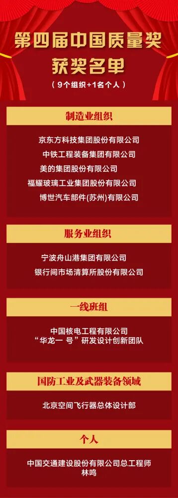 据了解,中国质量奖于2012年设立,是我国质量领域最高荣誉,通过“评管理”“评理念”,树立先进质量标杆,推广科学质量管理方法,不断提高我国质量水平。中国质量奖已经评选了三届,先后有20家组织和3名个人获奖。