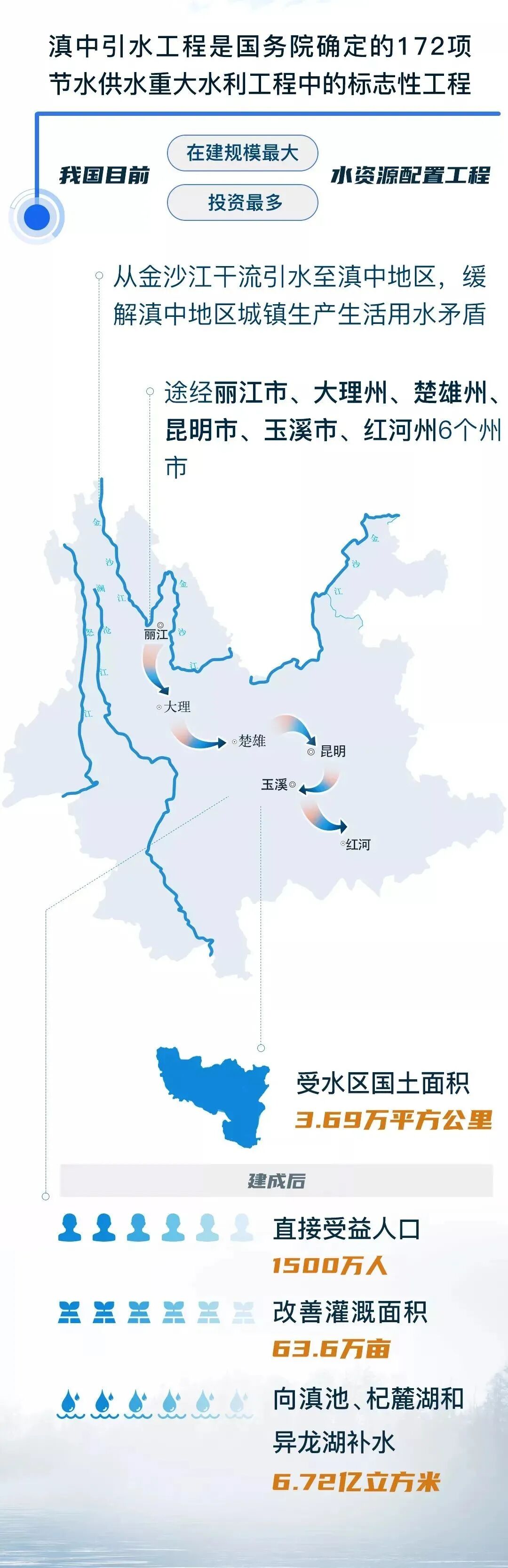 滇中引水工程是目前全国在建的引调水工程中投资规模最大、建设难度最高的水利工程。工程途经丽江、大理、楚雄、昆明、玉溪、红河,线路全长664公里,建成后每年平均引水量达34.03亿立方米,将有效缓解滇中缺水的困境。惠及沿线6州(市)36个县(市、区),受益国土面积3.69万平方公里,惠及人口1112万人,并为云南省建设面向南亚东南亚开放辐射中心提供稳定可靠的水资源保障。