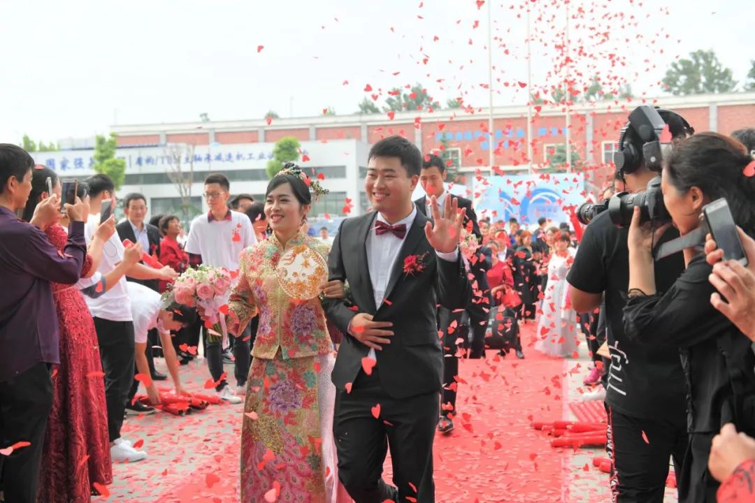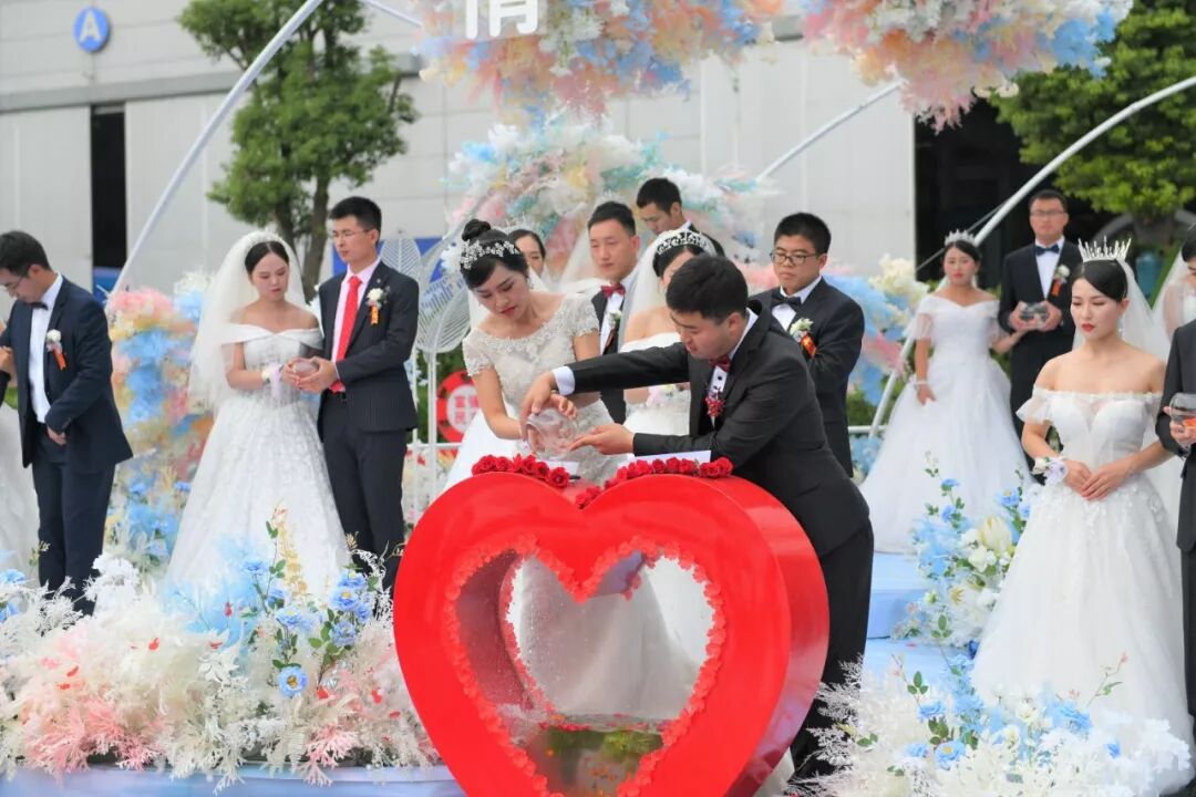 15对新人将象征着爱情与未来的锦鲤,倒入“十里同心”中,寓意在企业的庇护下爱情的小船越行越远,也寓意新人们相敬如宾,永结同心