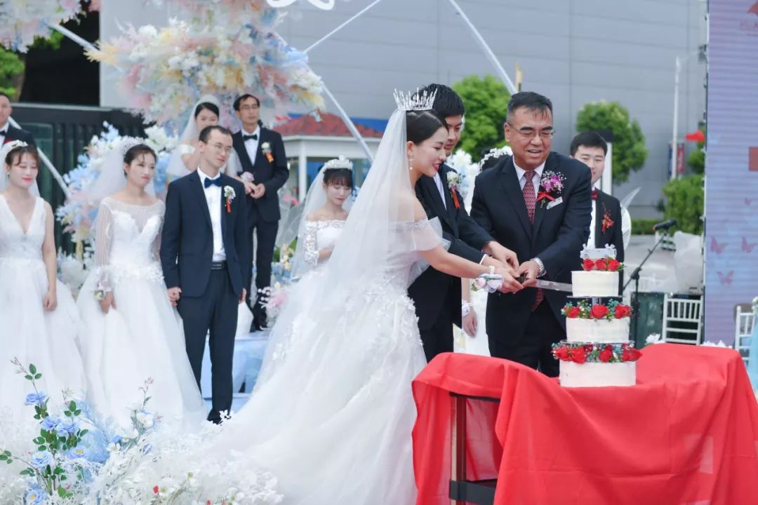 集团公司党委副书记、纪委书记、工会主席卜照华为新人送上祝福并与新人代表共同切开象征甜蜜和幸福的蛋糕