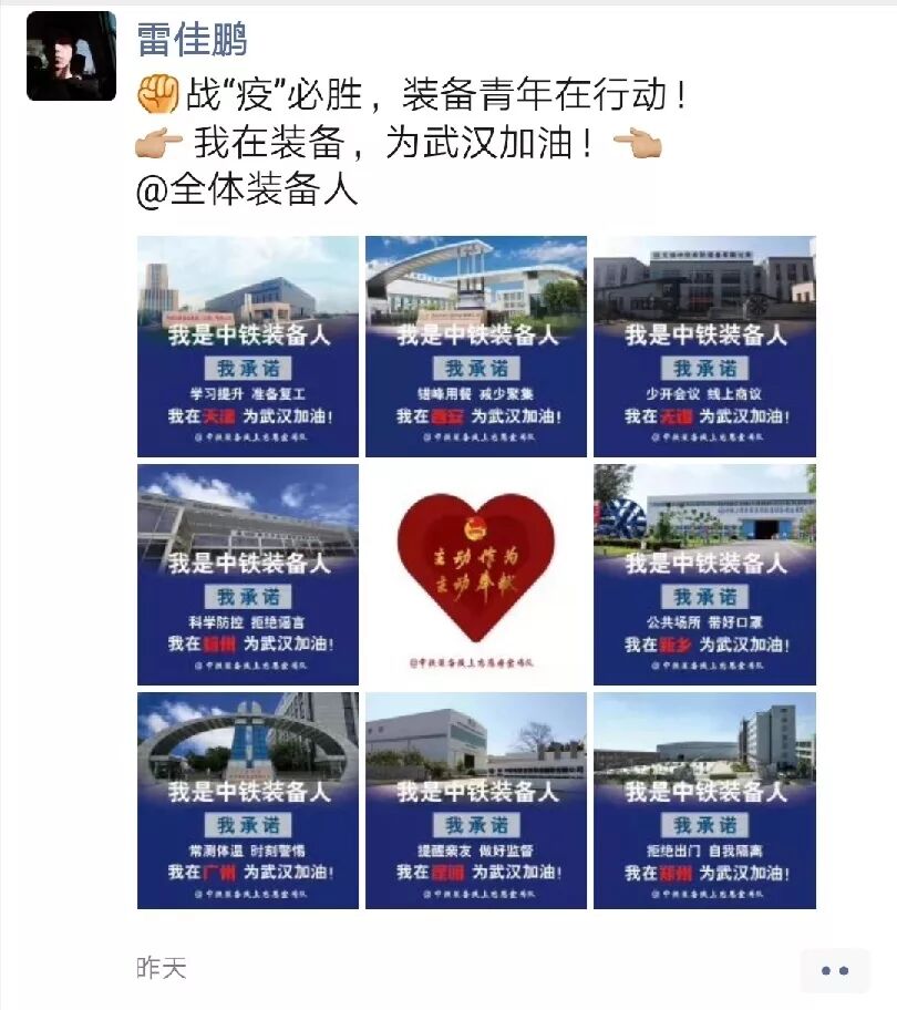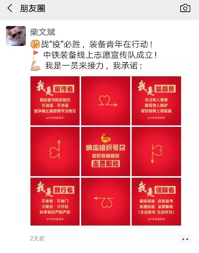 在疫情刚刚爆发阶段,中铁装备团委迅速反应,成立近400人的线上志愿宣传队,化身防疫战的网络急先锋,每天在微信朋友圈传播防控知识和正能量,为爱发声。