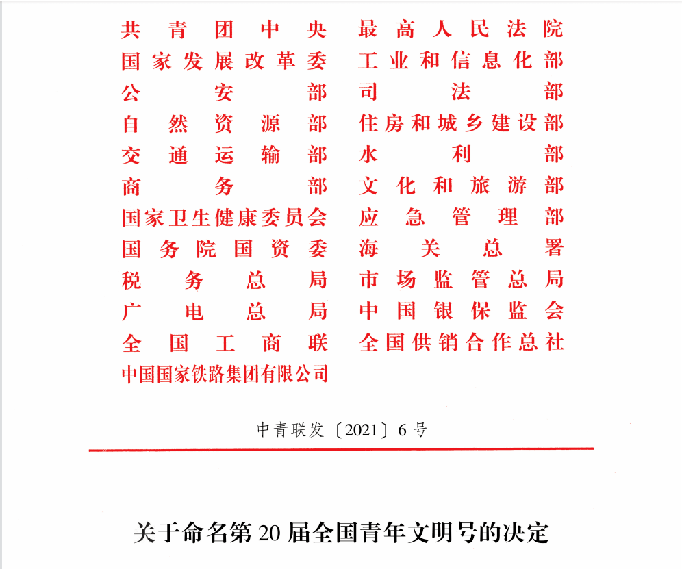 据悉,此次命名表彰由共青团中央、最高人民法院、发展改革委、工业和信息化部、公安部等23家全国创建“青年文明号”活动组委会成员单位联合开展,共有1881个创建集体被认定为“第20届全国青年文明号”。青年文明号活动自1994年启动实施,是面向职业青年群体,以“敬业、协作、创优、奉献”为理念,弘扬职业文明、培育先进集体和优秀人才,具有群众性、实践性、品牌性的精神文明创建活动。